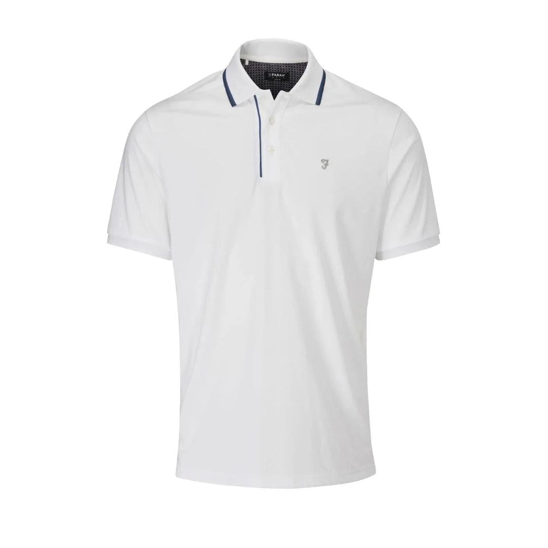 The Hoxie Polo Shirt gives the classic golf look with its flat ribbed collar and double tipping in contrasting colours on both the collar and down the side of the placket. The fabric itself gives a subtle textured feel and look aswell as a raised Farah ”F” logo is displayed on the left chest, with the Farah script featured at the back of the neck.