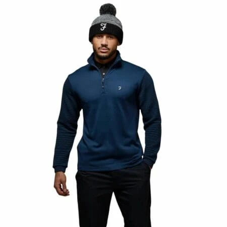 The Farah Warren 1/4 zip will be the ideal garment to wear on those cooler mornings and evenings out and about the golf course. A technical jacquard knit body and rib sleeves give a great look whilst offering maximum heat retention through the thermal properties. It is soft to the touch and highly breathable, making it a great choice for all-year wear.
