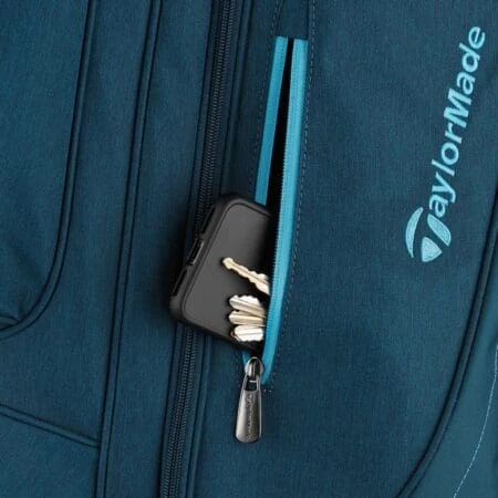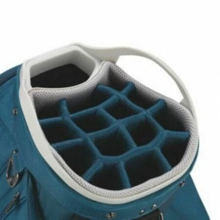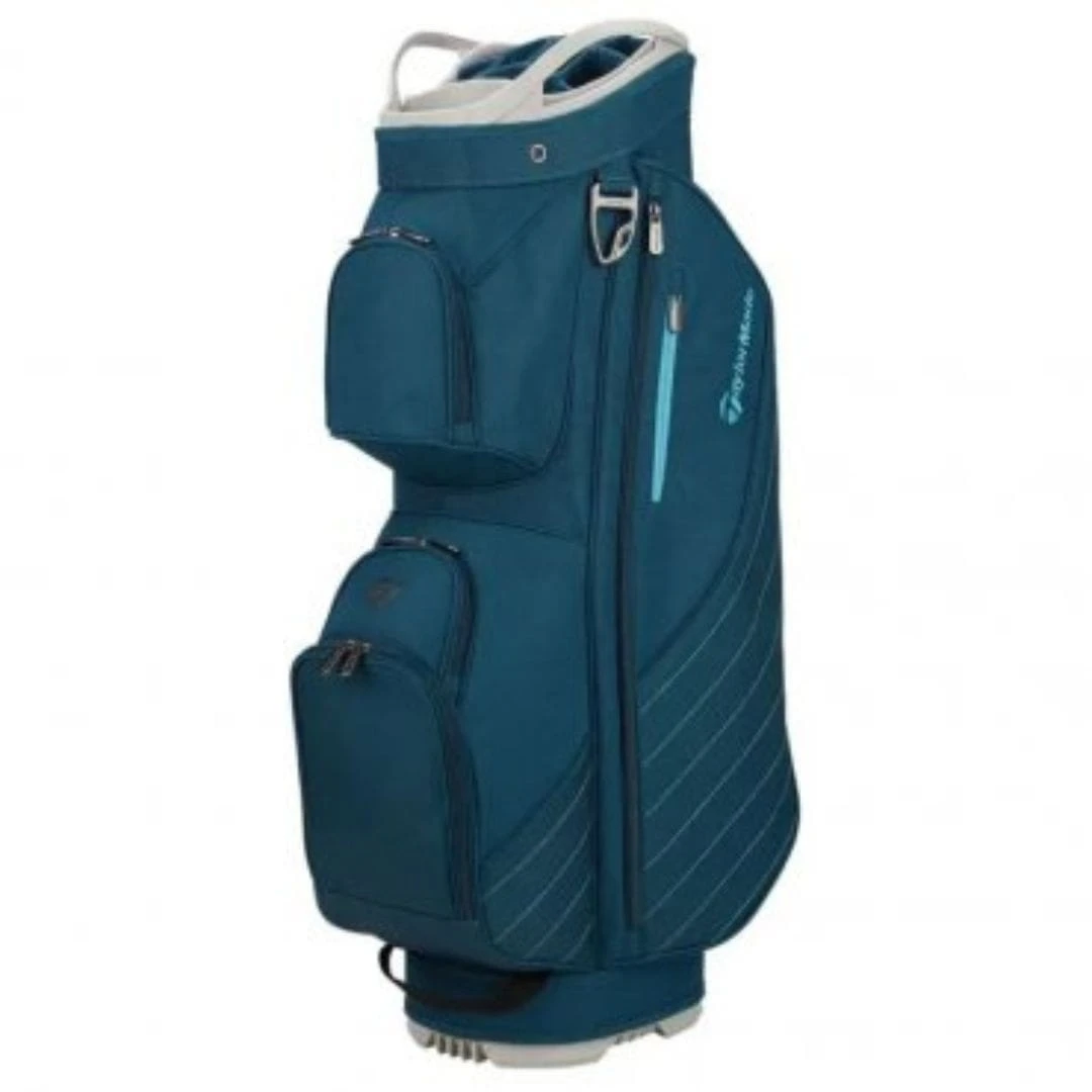 The TaylorMade Kalea Lanai golf cart bag features a 15 way top including a dedicated putter well, a total of six pockets including two large clothing pockets, velour lined valuables pocket, and multiple pockets for small essentials including golf balls, tees and a rangefinder. The base of this bag was constructed to fit onto a trolley and prevent sliding off and it will also stand upright while you set up your trolley. Top grab handles make this lightweight cart bag extremely easy to lift in and out of the car or onto a trolley or buggy and a rain hood will keep your clubs dry in rainy conditions. TaylorMade offer a 1 year warranty on this bag.